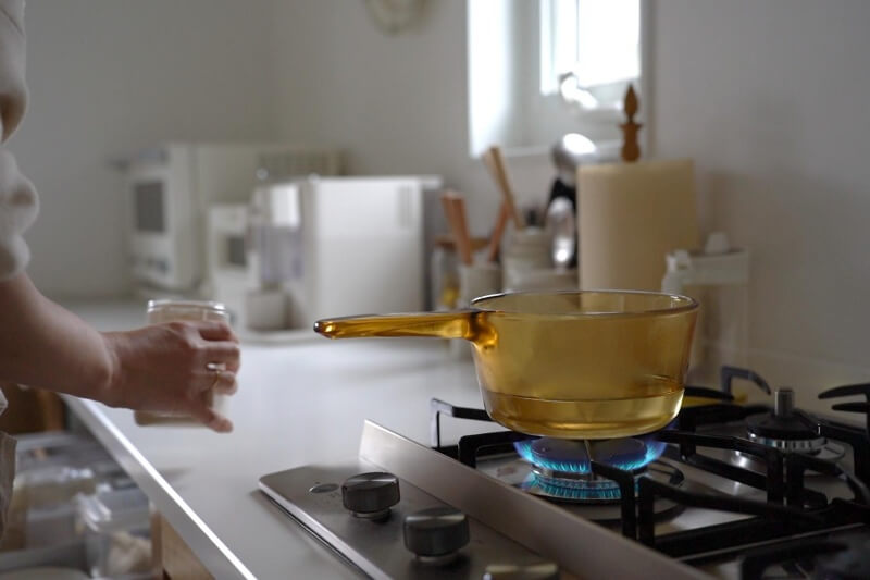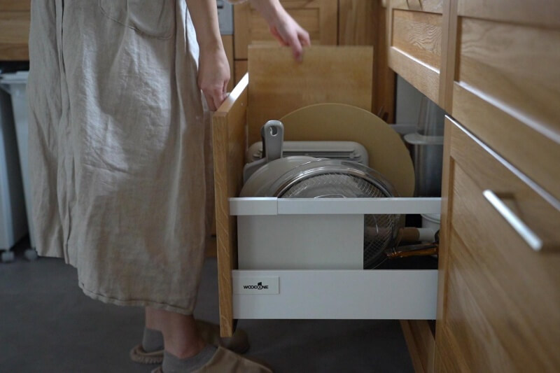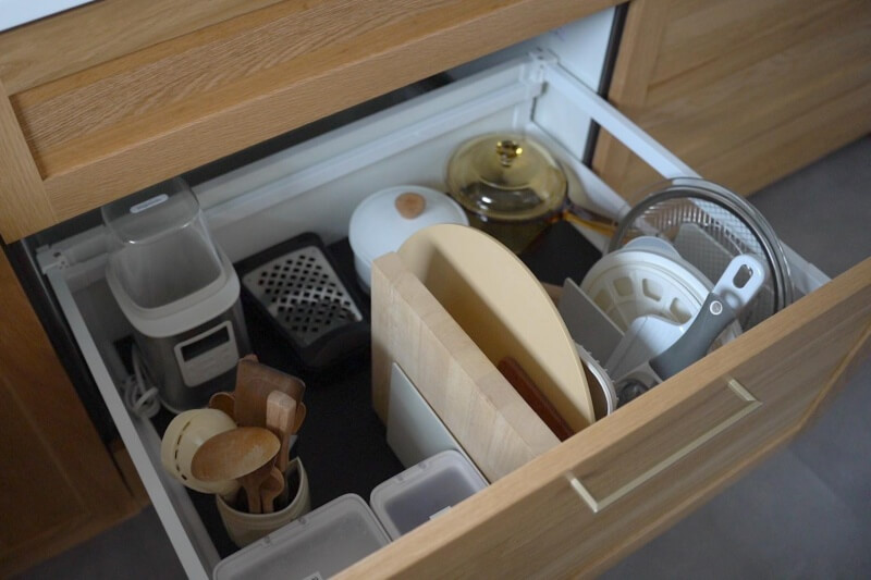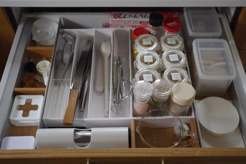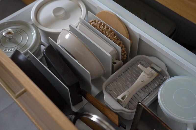 コンロで使う物はコンロ下の深い引き出しに収納しました。