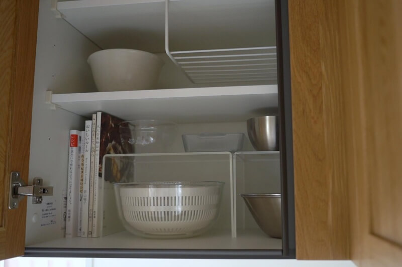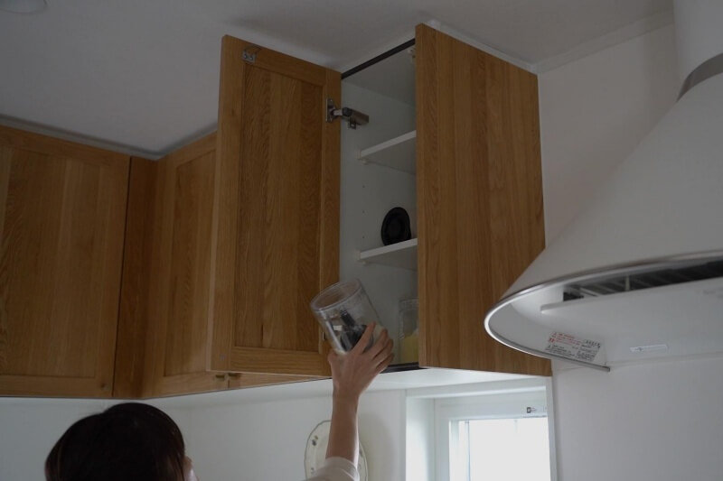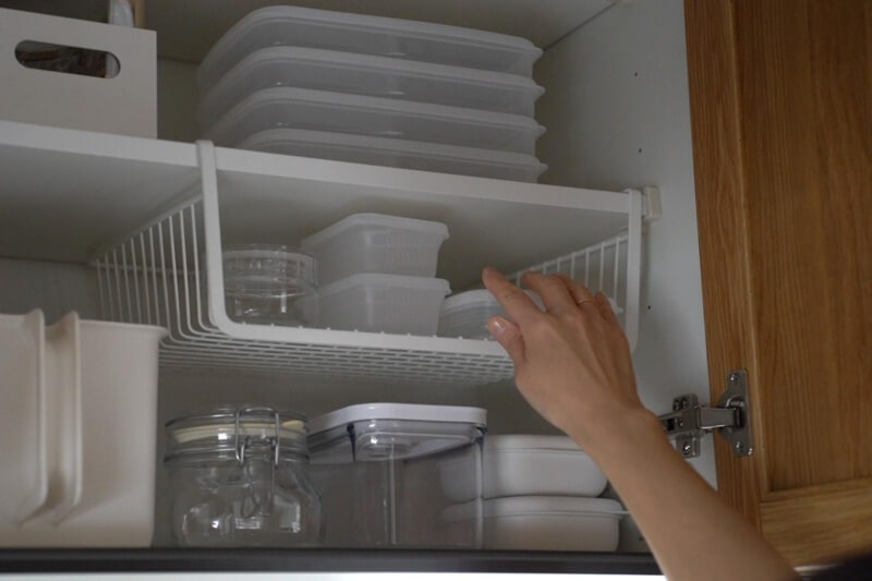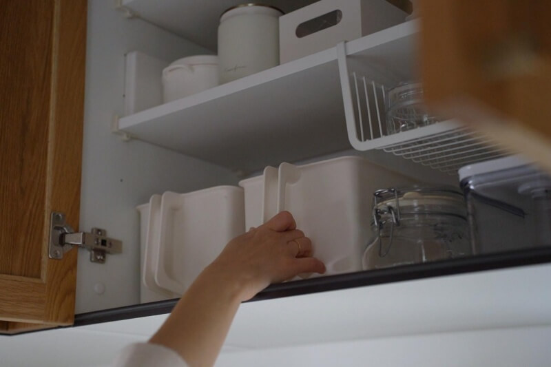 吊戸棚で使うケースは持ち手付きがおすすめです。