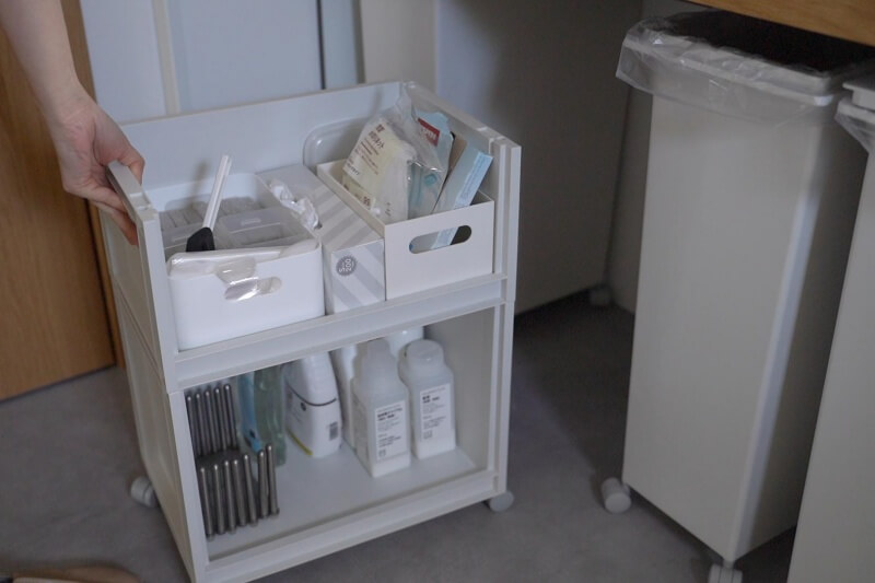 ただシンクで使う物もたくさんあるので、キャスターを付けられるラックを2段重ねて使うことに。