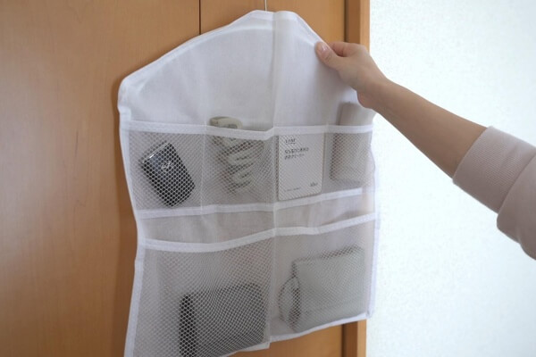 手持ちのハンガーにかけて小物収納に使えます。