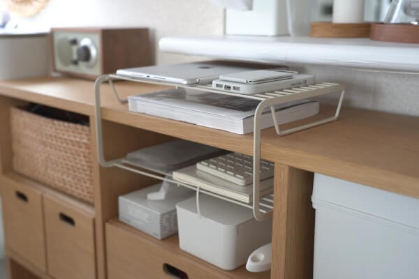 そのまま置いて棚のような使い方もできるし、棚板にひっかけて上下に収納を増やすこともできます。