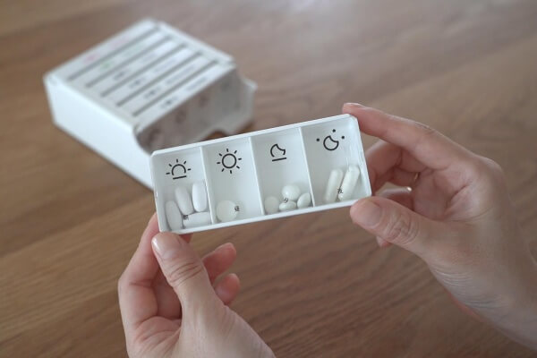 一日分も朝・昼・夕・夜の4ヶ所に分けて入れられて、一回分ずつ取りだせるのが便利です。