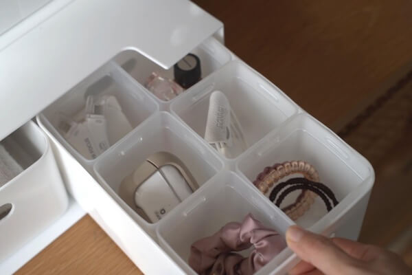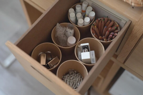 引き出しにそのまま物を入れるだけではごちゃごちゃですが、紙コップを入れて引き出しの中を仕切ることで、わかりやすく整理整頓出来ます。
