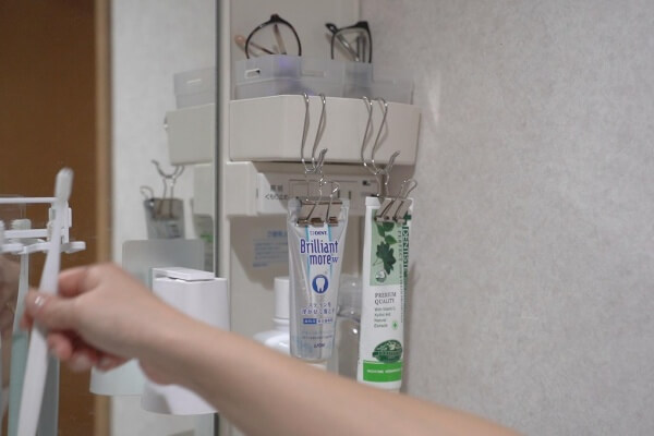 歯磨き粉などのチューブを挟みフックにかけて収納。