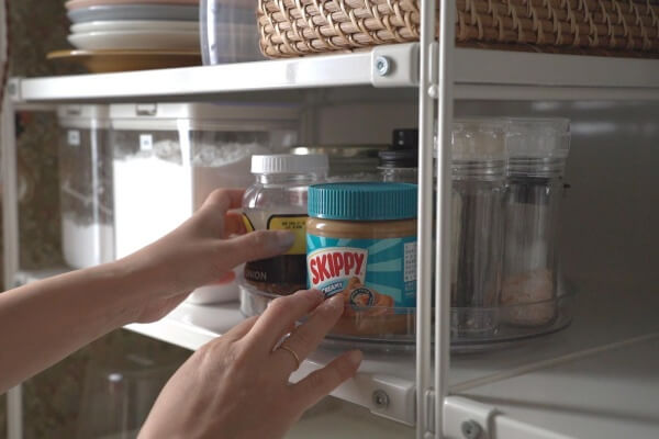 特に高い位置の収納は奥に何があるか見えにくいので、回転式のトレイを使うととても便利です。