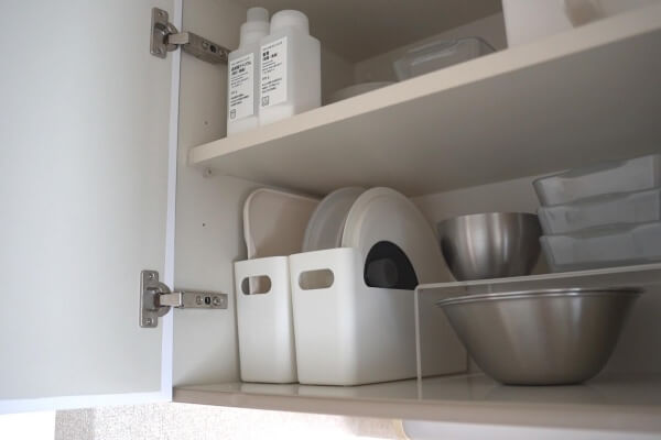キッチンの戸棚の中のすき間に置いてフタを立てたり、