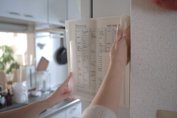 子どもの学校の行事表をサッと見れるように冷蔵庫の横に設置。