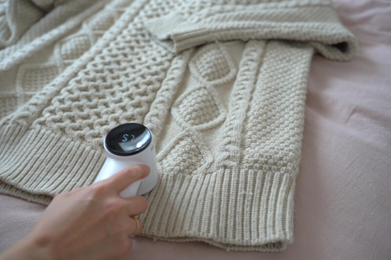 ニットなどの記事に軽く当てて滑らせるだけで、面白いほど毛玉が取れてまるで新品みたい!