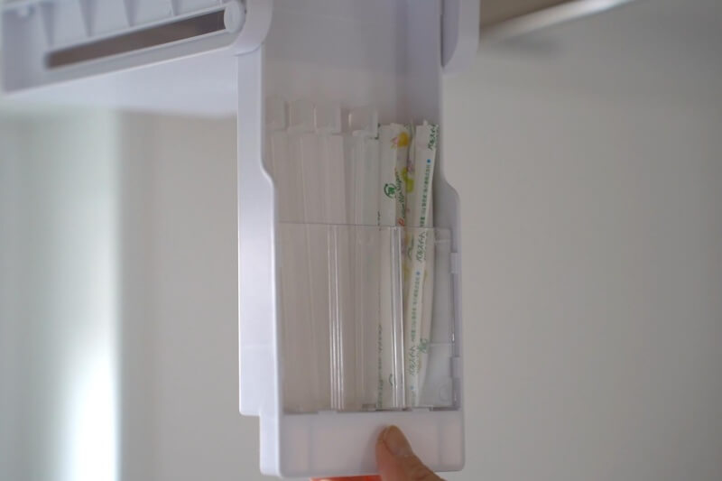 フタを開けて上から補充しておけば、使うときはフタを開けずにしたから取り出せます。