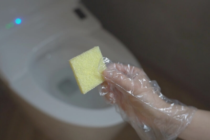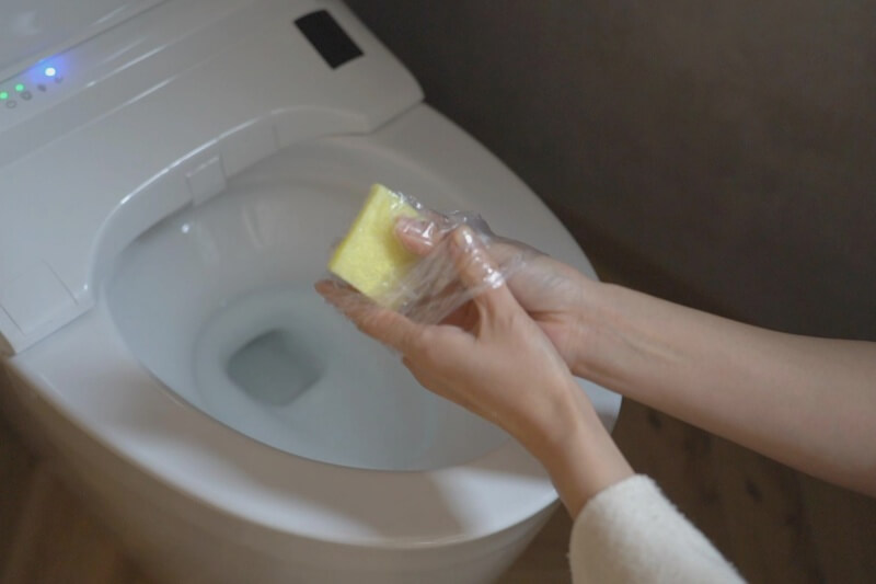 使い捨てのビニール手袋を付けて、クエン酸スポンジで便器をこすり洗いするアイデアが人気です。